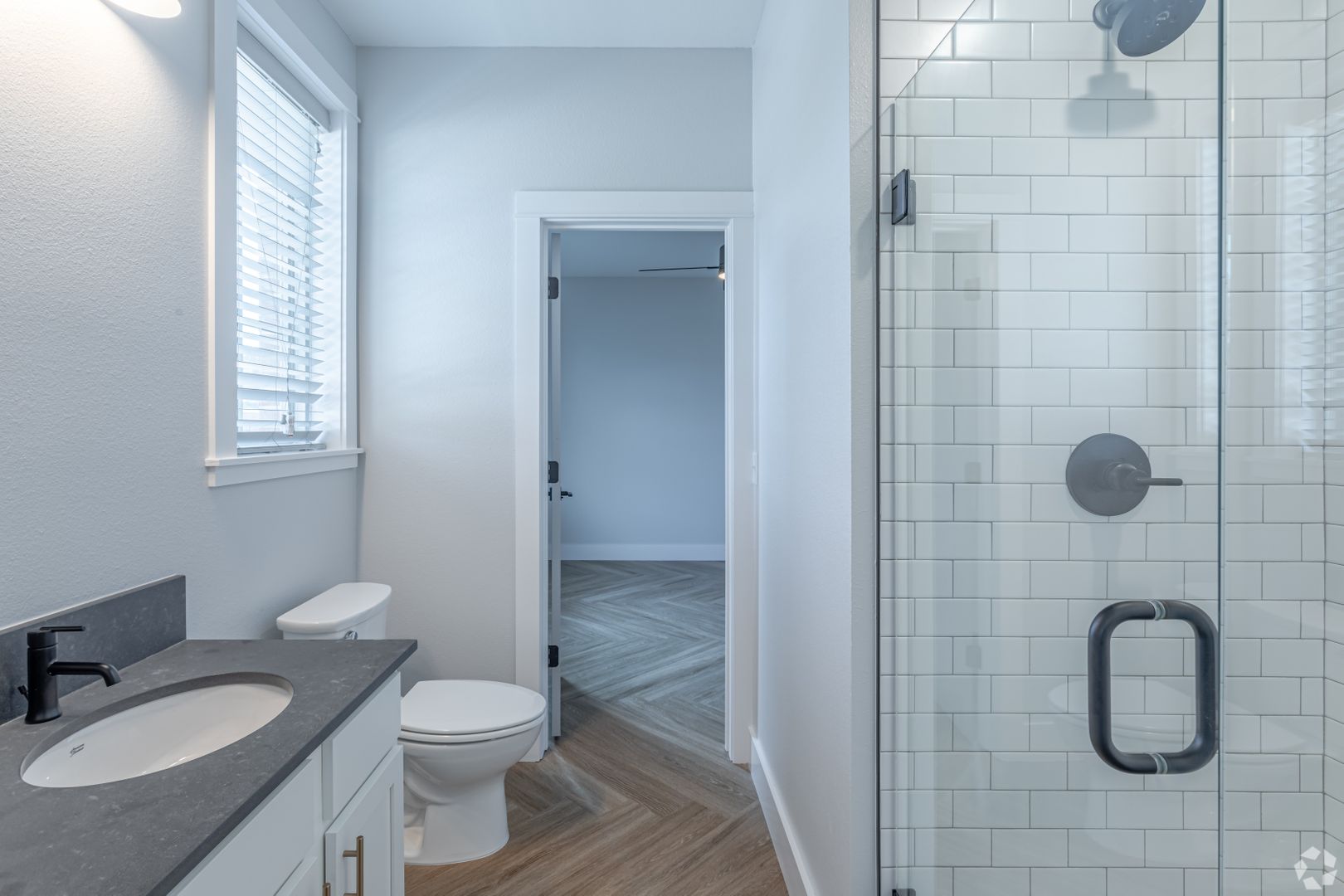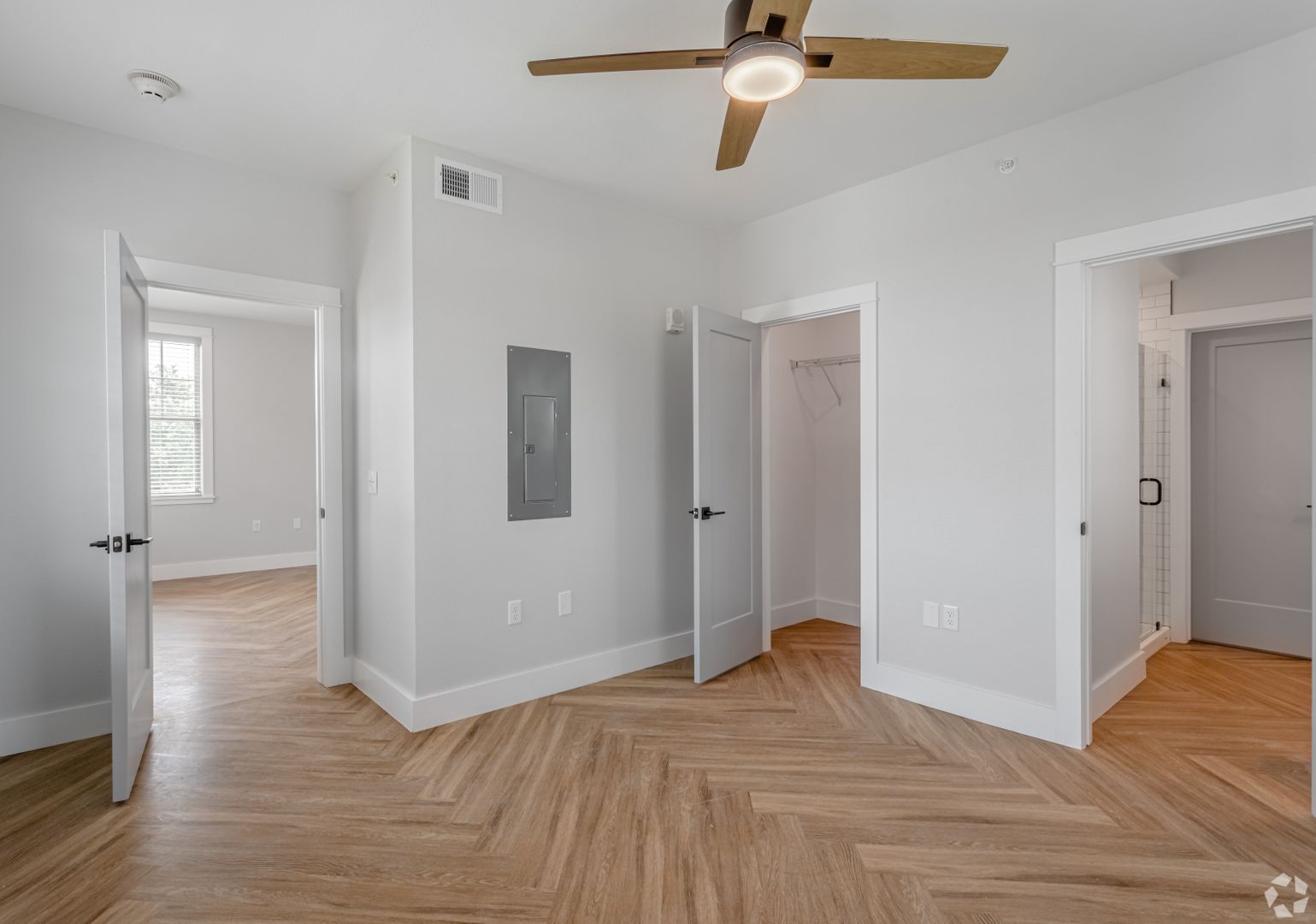 Enjoy soaring 9-foot ceilings and premium finishes including soapstone quartz countertops, tile-surround showers, and striking herringbone floors that bring a touch of timeless sophistication to every room. A full-size washer and dryer add everyday convenience, while a lighted oversize closet provides both functionality and flair.