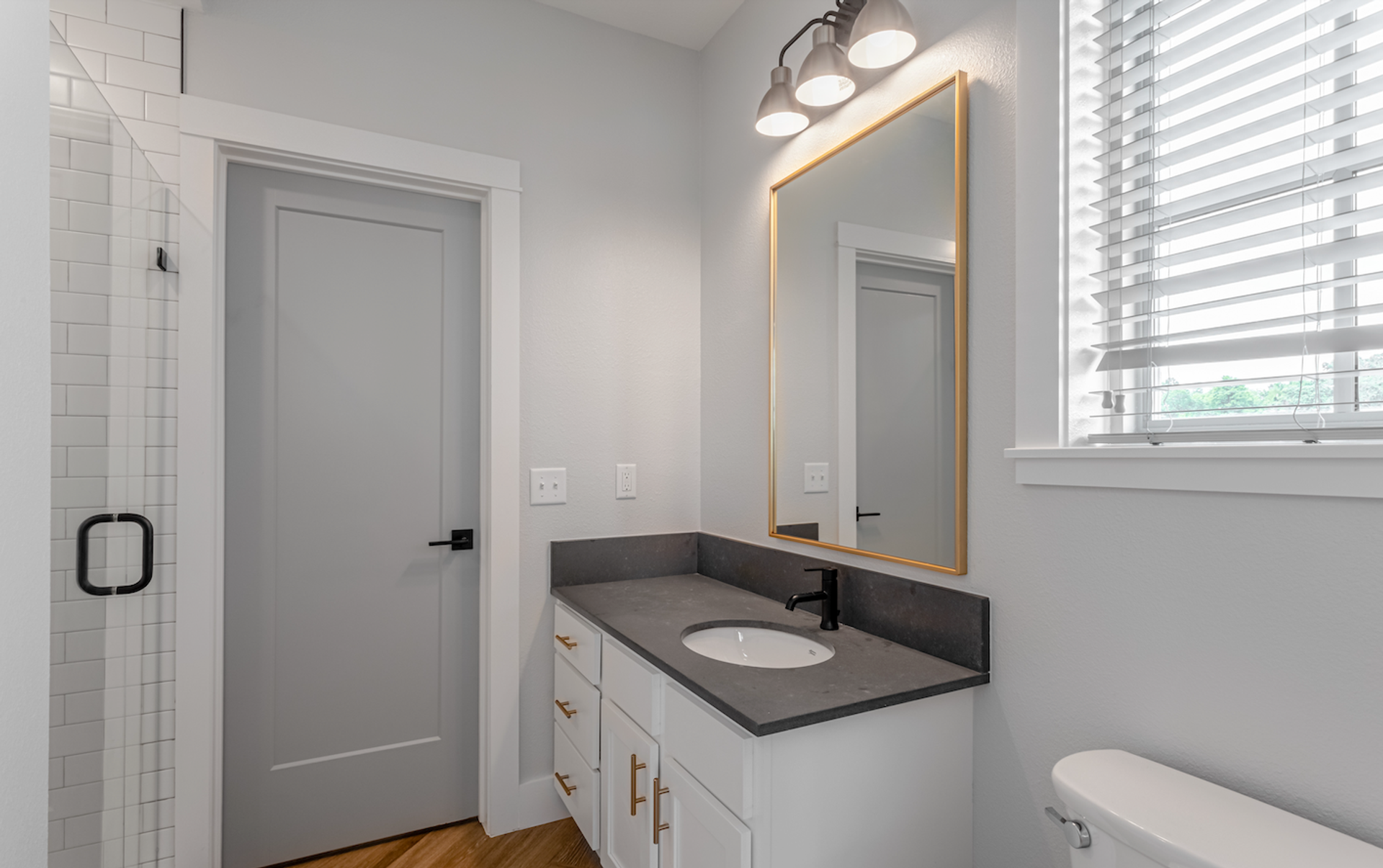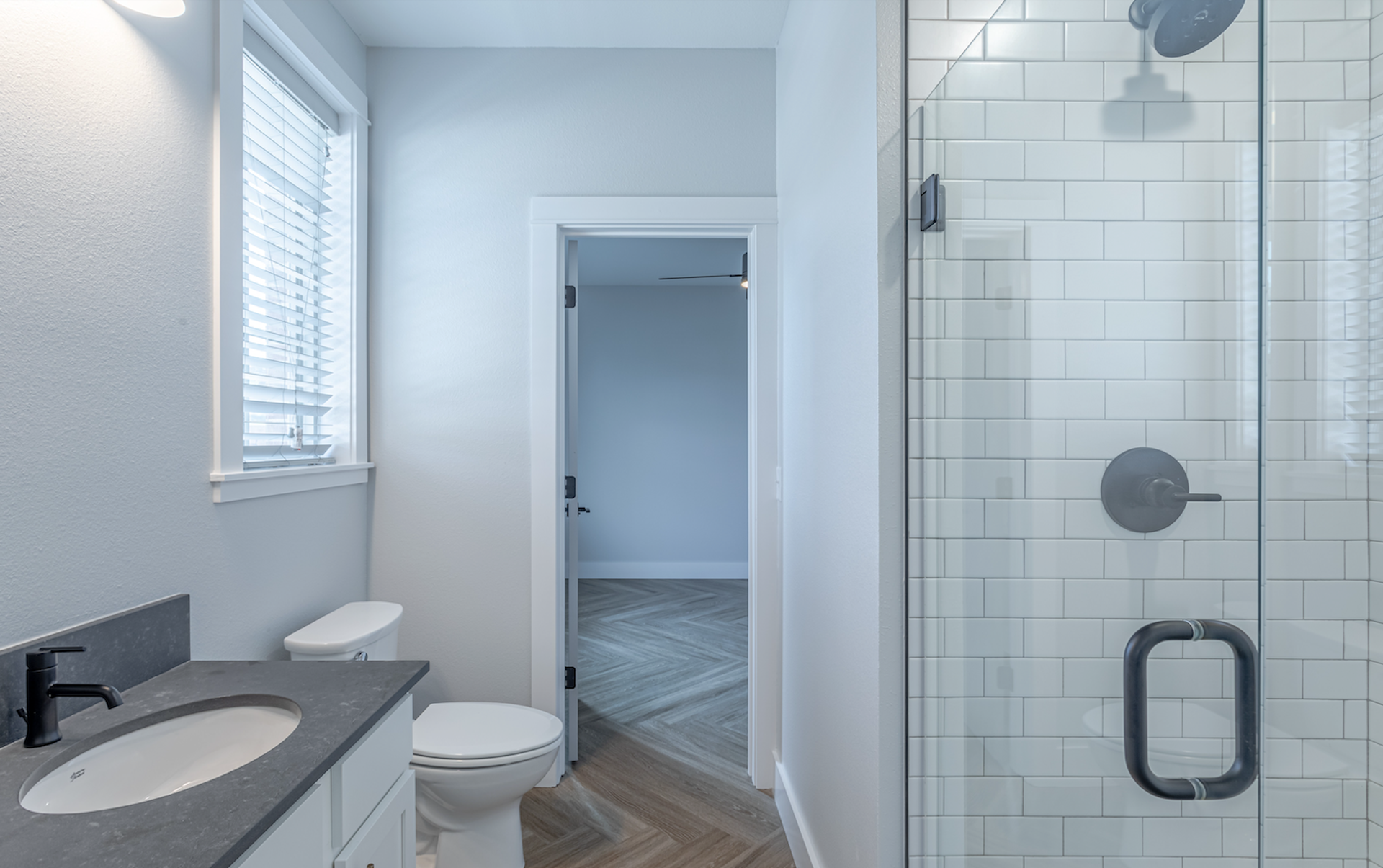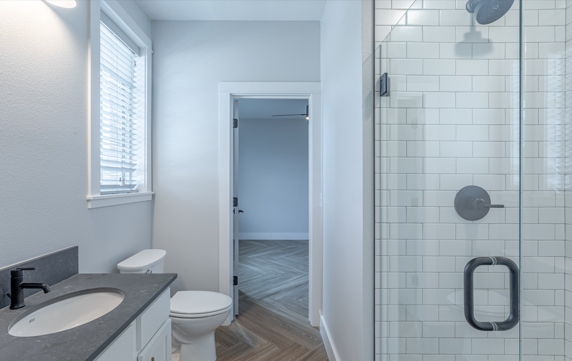 Natural light pours in from three sides through large windows, highlighting the home's airy layout and soaring 9-foot ceilings. Every detail is thoughtfully chosen, from the sleek soapstone quartz countertops and herringbone floors to the elegant tile-surround shower.