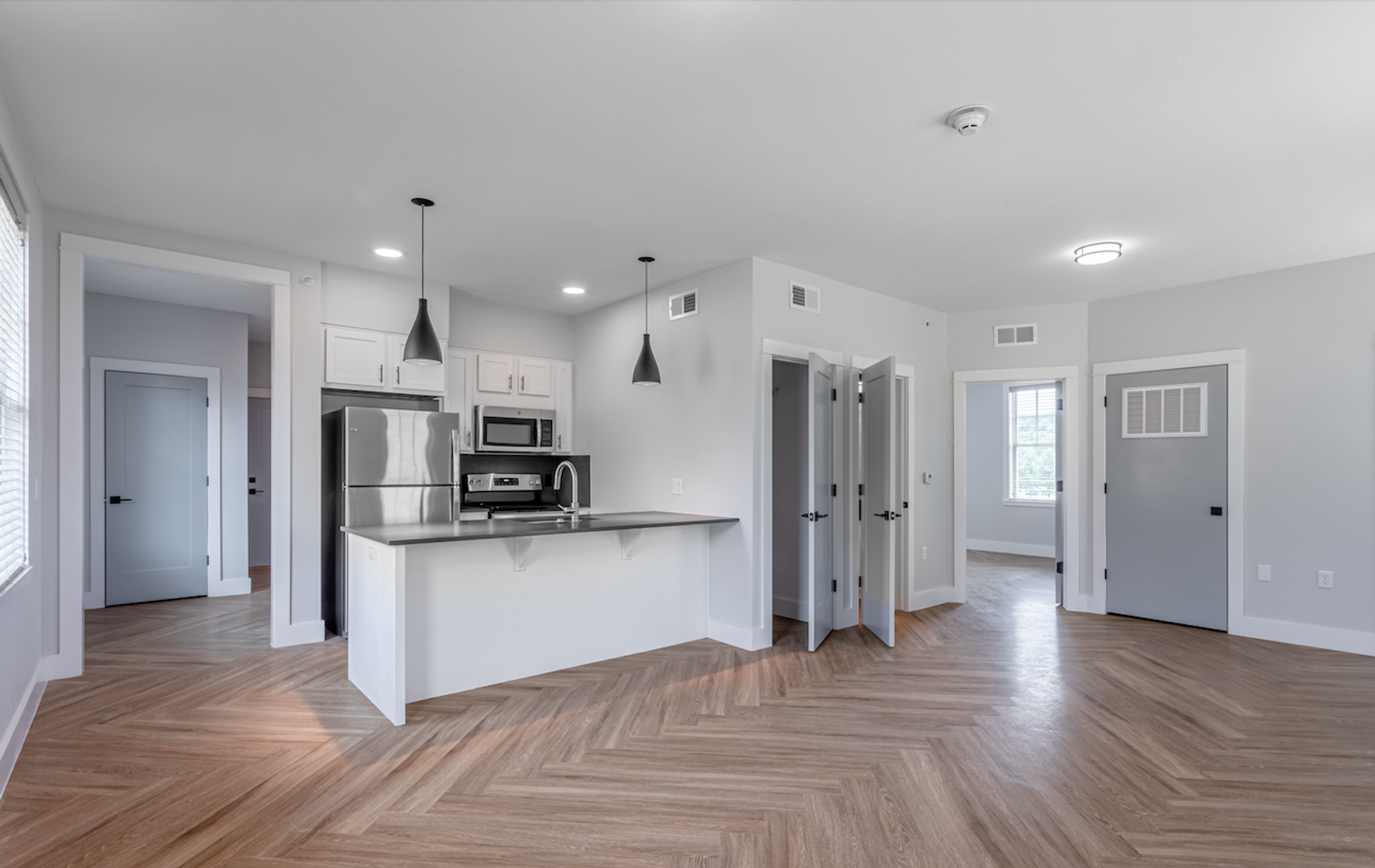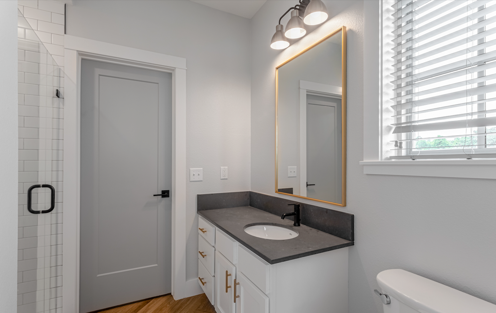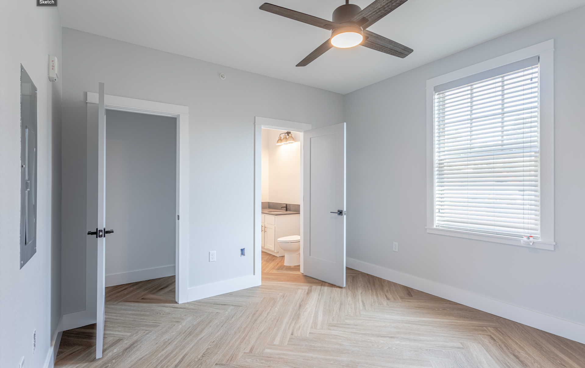 Natural light pours in from three sides through large windows, highlighting the home's airy layout and soaring 9-foot ceilings. Every detail is thoughtfully chosen, from the sleek soapstone quartz countertops and herringbone floors to the elegant tile-surround shower.